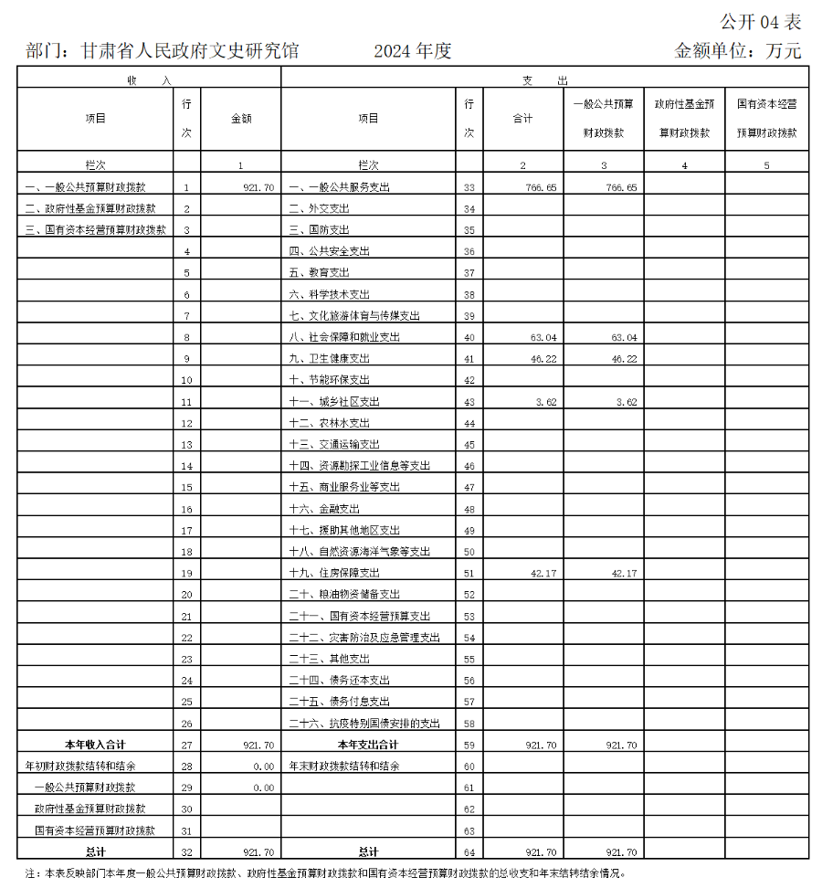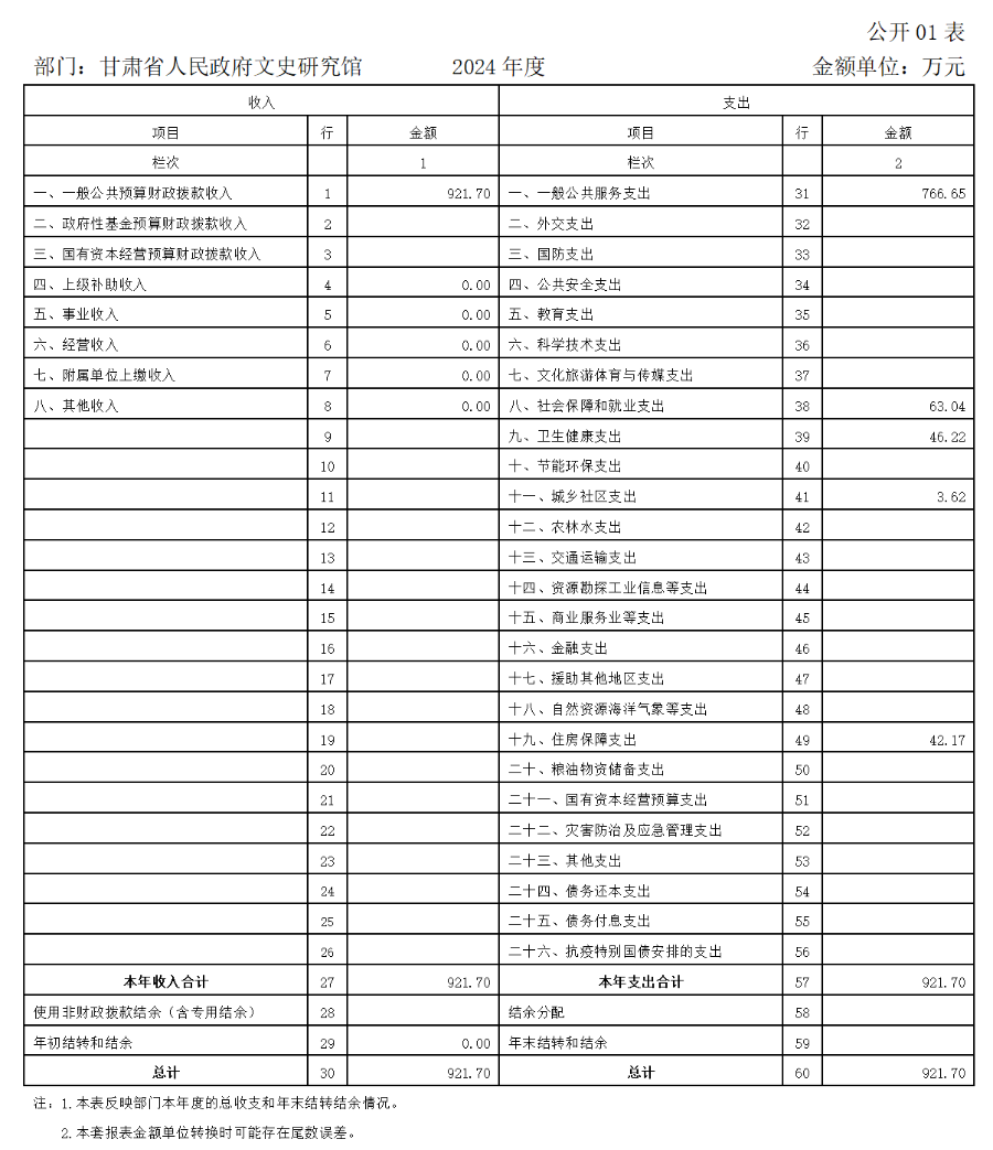 2024年度财政拨款收、支总计均为921.70万元。与上年相比,各减少72.93万元,下降7.33%。主要原因是在职人员减少,以及按照预算无法支出且无法更改用途的相关经费已上缴国库。