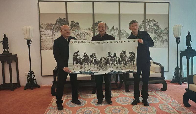 期间,王华存与敦煌研究院院长苏伯民就深化馆院合作展开深入交流,双方围绕整合文史研究资源、联合开展文化课题、推动敦煌文化普及等方向达成初步共识。王华存代表省政府文史馆还向敦煌研究院赠送了省政府文史馆馆员刘大林精心创作的《八骏图》书画作品,以艺术形式致敬敦煌文化与樊锦诗先生的奉献精神。